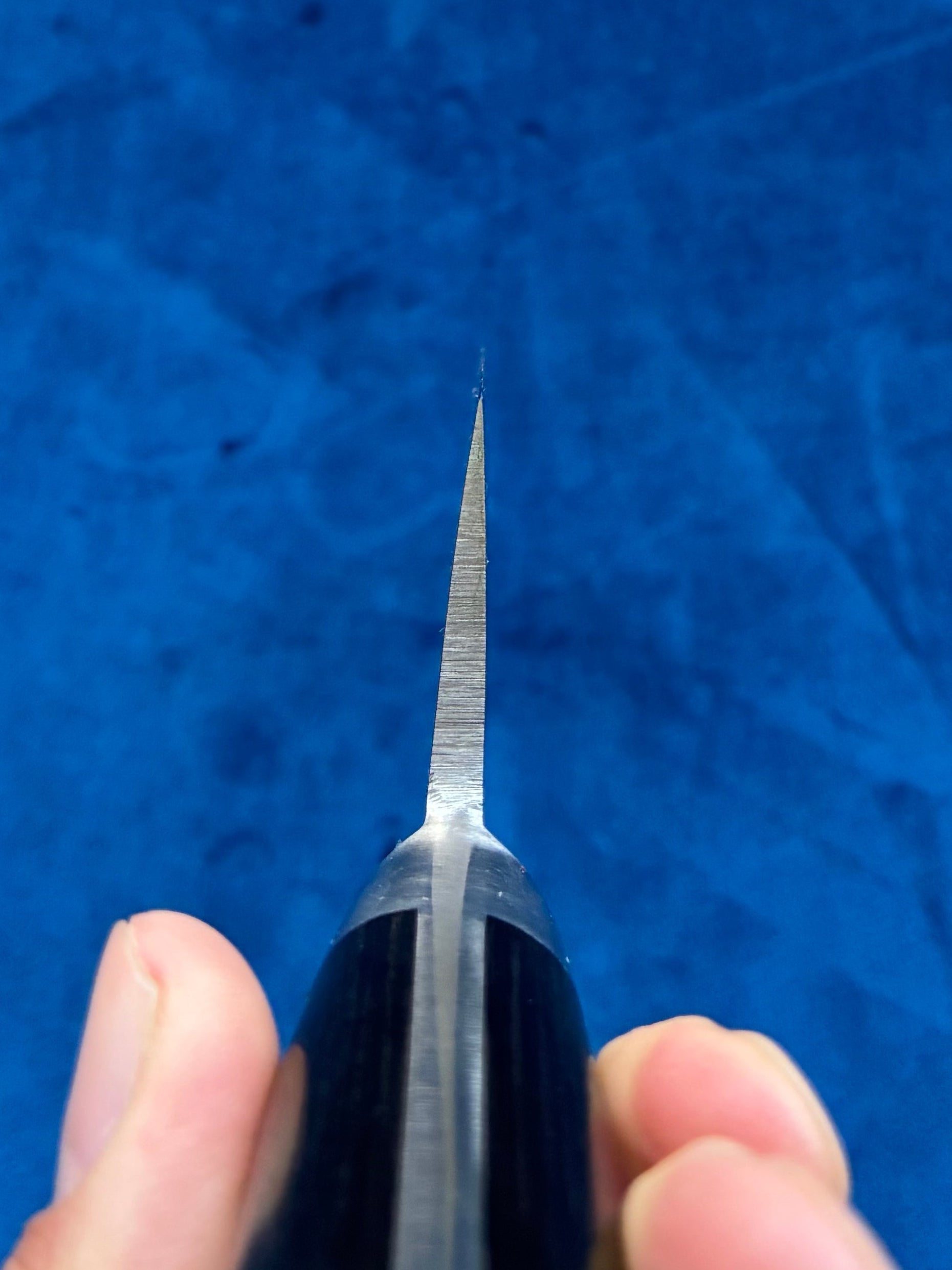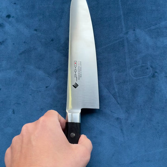 Por el filo tan delgado , no lo use para cortar los alimentos congelados o duros porque puede romperse. Aparte de lo anterior, nunca doble ni golpee el filo. Puede dañar la calidad del cuchillo.